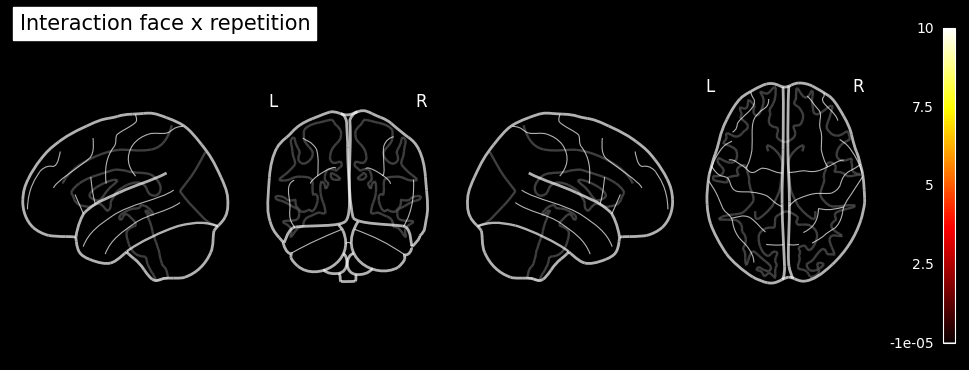 colorbar=True, display_mode='lyrz', black_bg=True, vmax=10, title='Interaction face x repetition');